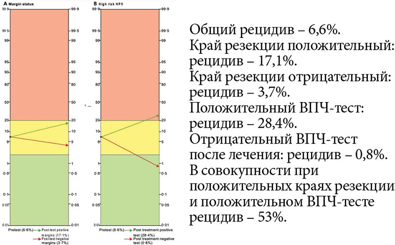 Согласно данным систематического обзора и метаанализа, при положительном крае резекции рецидив возникает в 17,1% случаев, при положительном ВПЧ-тесте – в 28,4%, при положительном крае резекции и положительном ВПЧ-тесте – в 53% (рис. 1)7. Неслучайно в клинических рекомендациях Минздрава России (2024) указана целесообразность проведения повторного оперативного лечения, если в краях резекции шейки матки или соскобе определяется HSIL2.