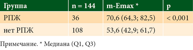 SWE-изображения были получены и проанализированы в другом схожем по дизайну исследовании N. Huang и соавт. [11]. Авторы подтверждают, что трансректальная сдвиговая волновая эластография (T-SWE) может использоваться неинвазивно для диагностики РПЖ и ДГПЖ. Ткань ПЖ рассматривали как эллипсоидальную сферу с вязкоупругими характеристиками. Для характеристики мягких тканей железы использовали линейную упругую модель. Это ретроспективное исследование включало 144 пациента с подозрением на заболевание ПЖ, которые прошли T-SWE в больнице. Среднее максимальное значение модуля Юнга (m-Emax) максимального поперечного сечения ПЖ было получено путем расчета среднего значения 12 измеренных максимальных значений модуля Юнга (Emax) в четырех квадрантах. Соответственно, m-Emax статистически коррелировал с ДГПЖ (табл. 2) и РПЖ (табл. 3) и имел хорошую дискриминацию.