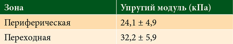 M. Zhang и соавт. при моделировании с помощью метода релаксации напряжений вязкоупругой ткани провели исследование ex vivo ПЖ и обнаружили: средние значения комплексных модулей Юнга (|E*|) нормальной и раковой тканей ПЖ составили 15,9 ± 5,9 кПа и 40,4 ± 15,7 кПа при 150 Гц соответственно, что давало упругий контраст 2,6 : 1. Цилиндрические образцы ткани задней области предстательной железы были получены после радикальной простатэктомии. Всего было протестировано 17 образцов тканей ПЖ человека – восемь нормальных (n = 8) и девять раковых (n = 9) [5]. L. Zhai и соавт. использовали количественные методы сдвиговой эластографии на образцах ex vivo и сообщили, что модуль Юнга нормальной периферической зоны и раковой ткани ПЖ составил 12,3 ± 2,4 кПа и 30 ± 3,0 кПа соответственно [6]. Хотя жесткость в разных исследованиях различалась, в обоих исследованиях было обнаружено, что на раковых участках ткань примерно в 2,5 раза жестче по сравнению с тканью периферической зоны ПЖ.