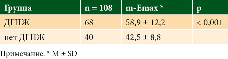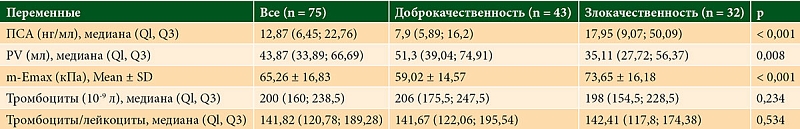 При этом однофакторный анализ показал, что уровень ПСА, объем ПЖ, среднее максимальное значение модуля Юнга (m-Emax) достоверно различались в группах пациентов с доброкачественными (m-Emax = 59,02 ± 14,57 кПа) и злокачественными (m-Emax = 73,65 ± 16,18 кПа) новообразованиями (Mean ± SD).