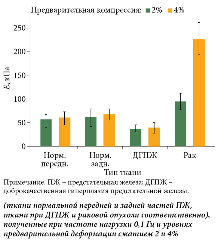 Для оценки динамического диапазона ткани, полученной с помощью эластографии, было исследовано механическое поведение образцов ткани молочной железы и ПЖ, подвергнутых компрессионной нагрузке (T. Krouskop и соавт.) [14]. Установлено, нормальная ткань ПЖ имеет модуль упругости ниже, чем модуль упругости исследованных образцов РПЖ (рис. 2). Ткань ПЖ с ДГПЖ имела значения модуля упругости значительно ниже, чем нормальная ткань. Наблюдалось постоянное, но несущественное различие в модуле упругости тканей, взятых из передней и задней частей железы. Диапазон модулей Юнга составил: для нормальной ткани железы – 55–71 кПа, при наличии ДГПЖ – 36–41 кПа, для раковой ткани – 96–241 кПа. Различия в модулях упругости различных тканей железы, по мнению авторов, могут быть полезны при разработке методов различения доброкачественных и злокачественных опухолей.