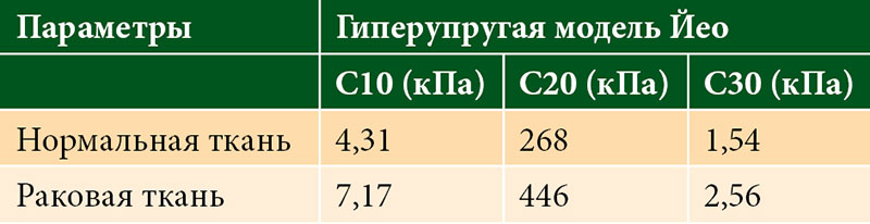 Коэффициент Пуассона мягких тканей приблизительно принимался равным 0,495 из-за их несжимаемости (С.А. Муслов и соавт.) [27]. Таким образом, параметр гиперупругости опухоли μ напрямую связан с ее модулем упругости E, и, следовательно, расчет μ приводит к оценке модуля упругости. Что касается моделируемой ткани, значение модулей упругости опухоли предполагалось в диапазоне 50–120 кПа, что включает в себя как нормальную, так и раковую ткани (T.A. Krouskop и соавт.) [14]. В модели Огдена для опухоли предполагалось 15 различных значений упругости. Кроме того, как для нормальной, так и для раковой ткани была применена гиперупругая модель Йео с параметрами, представленными в табл. 6.