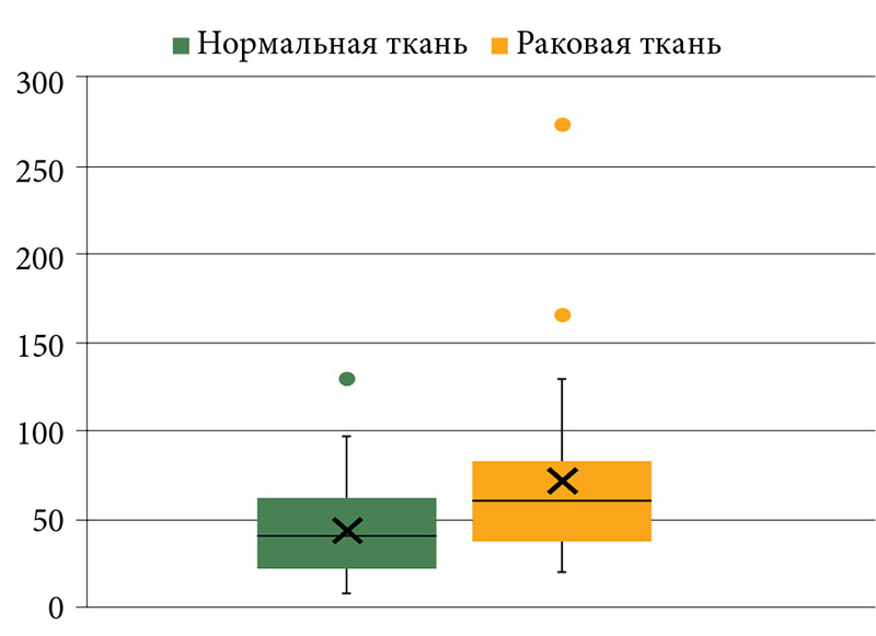 На рисунке 5 рассмотренные в обзоре данные по модулю Юнга тканей предстательной железы представлены с помощью диаграммы Box & Whiskers, из которой тоже видно, что раковая ткань жестче нормальной (p < 0,05).