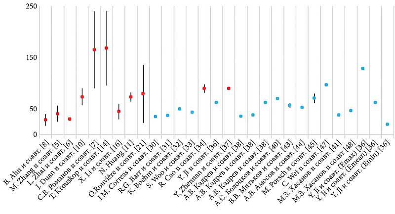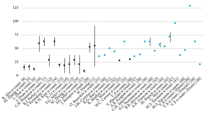 Представленные в обзоре численные данные нормальной и раковой тканей ПЖ можно видеть сгруппированными на рис. 3 и 4. Среднее значение модуля Юнга ПЖ составило 43,96 ± 8,36 кПа и 72,10 ± 19,55 кПа (M ± 95% ДИ) нормальной и раковой тканей соответственно. То есть опухолевая ткань в среднем примерно в 1,65 раза жестче нормальной. Данные из исследования B.Johnson и соавт. [9], не попавшие в обычный интервал значений модуля Юнга тканей ПЖ, было решено не рассматривать и не размещать на диаграммах.