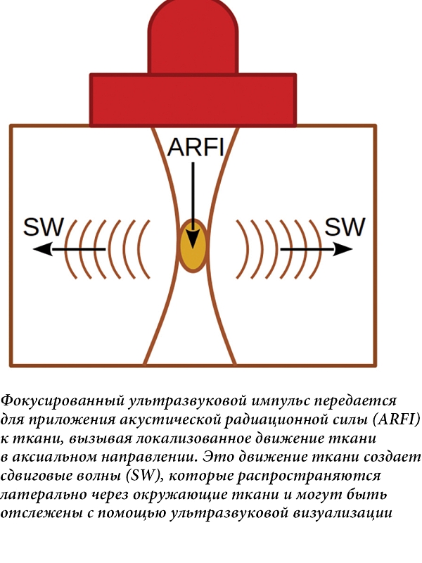 Параметры ультразвуковой волны подбирают так, что радиационное давление будет максимальным там, где необходимо генерировать сдвиговые волны (рис. 1).