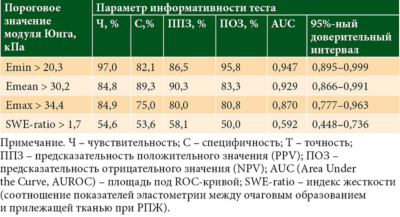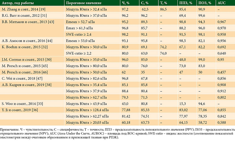 В исследовании, проведенном R.G. Barr и соавт., при меньшем числе пациентов (n = 53) пороговое значение 37 кПа для различения доброкачественных и злокачественных поражений обеспечило чувствительность – 96,2%, специфичность – 96,2%, PPV – 69,4% и NPV – 99,6% [31].