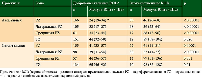 Целью исследования O. Rouvière и соавт. было измерение жесткости доброкачественной и злокачественной тканей ПЖ с помощью сдвигово-волновой эластографии (SWE) [21]. В ходе исследования 30 последовательным пациентам была проведена трансректальная SWE в аксиальной и сагиттальной плоскостях перед простатэктомией. После изучения образцов простатэктомии рентгенологи измерили жесткость в областях, соответствующих раку: латеральной и срединной доброкачественной периферической зонах (PZ) и доброкачественной переходной зоне (TZ). Раковые опухоли были более жесткими, чем доброкачественные ткани PZ и TZ. Все классы тканей были более жесткими на сагиттальной, чем на аксиальной зонах, в TZ, чем в PZ, в срединной TZ, чем в латеральной PZ зонах. При многофакторном анализе характер ткани (доброкачественная или злокачественная; p < 0,00001), плоскость сканирования (аксиальная или сагиттальная; p < 0,00001) и расположение в предстательной железе (TZ, срединная PZ или латеральная PZ; p = 0,0065) достоверно и независимо влияли на жесткость ткани. На аксиальных изображениях пороги, максимизирующие индекс Юдена в TZ, латеральной PZ и срединной PZ, составляли 62, 33 и 49 кПа соответственно (А.М. Беляев и соавт.) [22]. На сагиттальных изображениях пороги составляли 76, 50 и 72 кПа соответственно. Детально результаты изучения распределения жесткости тканей железы представлены в табл. 5. Несмотря на установленные статистически значимые различия в жесткости тканей во всех зонах интереса, отметим относительно высокие значения p-value и межквартильного размаха, соответствующие переходной зоне железы.
