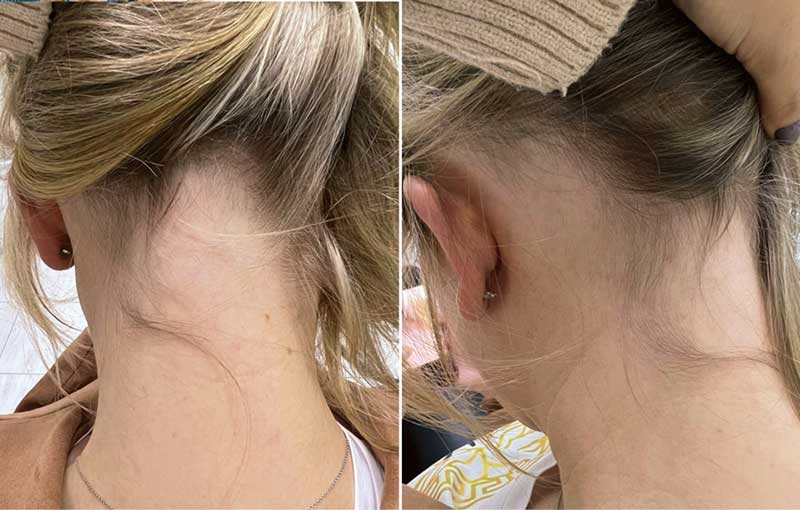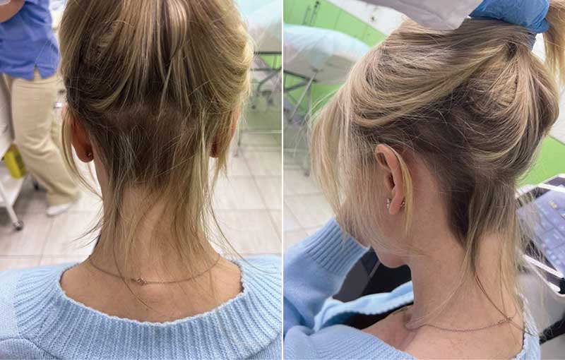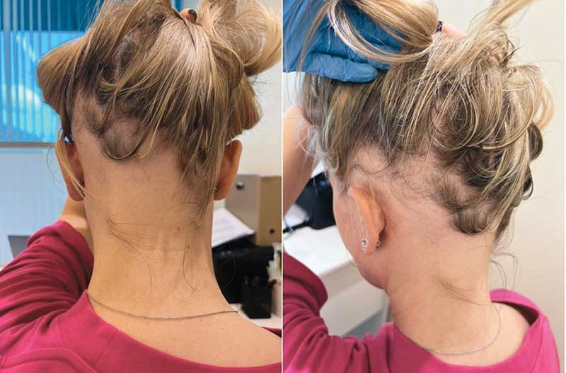 В клинику трихологии «Наутилус» обратилась женщина 36 лет с жалобами на очаговое выпадение и отсутствие роста волос в области затылка и левого виска. Со слов пациентки, описанные симптомы сохраняются в течение четырех месяцев. Из анамнеза жизни известно, что аналогичный одиночный очаг на затылочной области возник в 2021 г. с последующим самозарастанием зоны потери волос в течение нескольких месяцев. Настоящее обострение интенсивнее по клиническим проявлениям и без положительной динамики в течение нескольких месяцев, в связи с чем пациентка решила обратиться к трихологу. Предшествующая терапия: самостоятельное наружное использование мази с 0,05%-ным клобетазола пропионатом в течение двух месяцев (нерегулярно, от трех до пяти раз в неделю, однократно в день).
