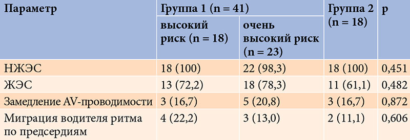 Все пациенты имели нарушения ритма сердца по типу НЖЭС и/или ЖЭС. При анализе данных ХМ статистически значимой разницы в частоте НЖЭС, ЖЭС, эпизодов замедления атриовентрикулярной проводимости (AV-проводимости) и миграции водителя ритма по предсердиям в группах не зафиксировано (табл. 2).
