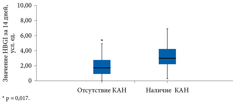 У пациентов с КАН выявлено статистически значимое повышение значений HBGI (p = 0,017) (рис. 2).