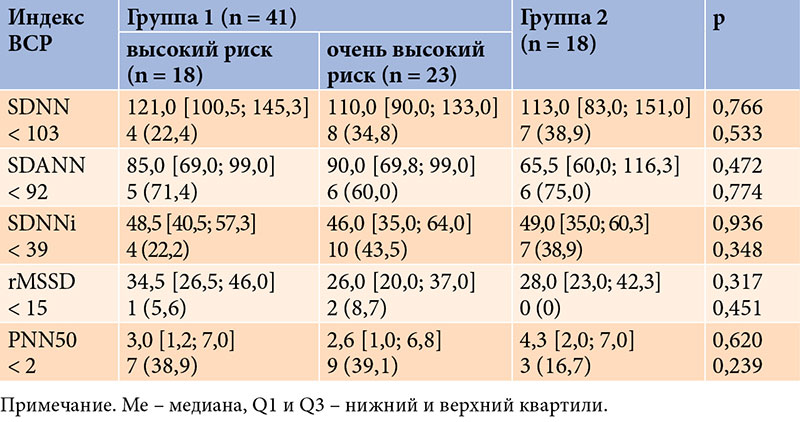 Анализ ВСР показал, что медиана индекса SDANN во всех группах была ниже нормальных значений, статистически значимых различий в группах не выявлено. Другие временные параметры ВСР в группах также статистически значимо не различались (табл. 4).