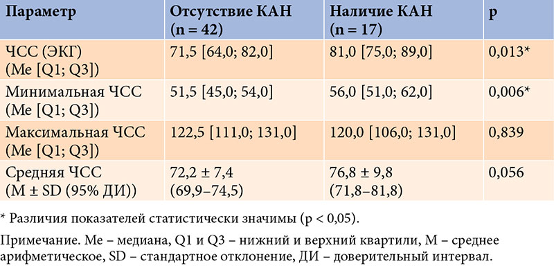 У пациентов с диагностированной КАН отмечено статистически значимое повышение ЧСС в покое по данным ЭКГ и минимальной ЧСС по данным ХМ. Значения максимальной и средней ЧСС достоверно не различались в группах (табл. 6).