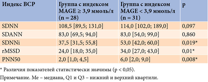 При проведении сравнительного анализа индексов ВСР в зависимости от индекса MAGE были обнаружены достоверные различия. Так, значения индексов ВСР были ниже у пациентов с высокой ВГ (табл. 5).