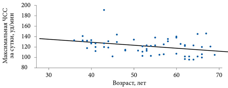 При проведении корреляционного анализа у всех пациентов выявлены прямая связь между максимальной ЧСС и уровнем HbA1c (r = 0,441, p < 0,001), а также СКФ (r = 0,363, p = 0,005) и обратная связь между максимальной ЧСС и возрастом (r = -0,343, p = 0,008) (рис. 1). Между средней ЧСС и возрастом пациентов прослеживалась обратная связь (r = -0,27, p = 0,039).
