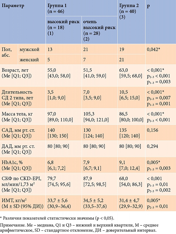 В группе 1 были выделены две подгруппы – высокого и очень высокого сердечно-сосудистого риска. К первым были отнесены пациенты без поражения органов-мишеней с длительностью СД 2 типа ≥ 10 лет или без поражения органов-мишеней с одним или двумя основными факторами сердечно-сосудистого риска, а именно возраст ≥ 50 лет, артериальная гипертензия, дислипидемия, курение, ожирение. Подгруппу очень высокого сердечно-сосудистого риска составили пациенты с поражением органов-мишеней (протеинурия, скорость клубочковой фильтрации (СКФ) < 45 мл/мин/1,73 м2, СКФ 45–59 мл/мин/1,73 м2 в сочетании с микроальбуминурией, гипертрофия левого желудочка или ретинопатия) или с двумя и более основными факторами сердечно-сосудистого риска либо пациенты с длительностью СД 2 типа более 20 лет.