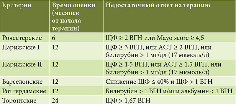 Так, согласно Парижским критериям I, уровень ЩФ спустя 12 месяцев терапии должен составлять менее  3 ВГН; с учетом Парижских критериев II требуется снижение ЩФ ниже 1,5 ВГН. В представленном клиническом наблюдении динамика ЩФ на фоне лечения была минимальной (спустя шесть месяцев терапии отмечалось снижение ЩФ с 412 до 312), в последующем зафиксирована отрицательная динамика в виде нарастания холестаза (повышение ЩФ до 510, то есть до 4 ВГН); снижение маркеров цитолиза также было недостаточным.