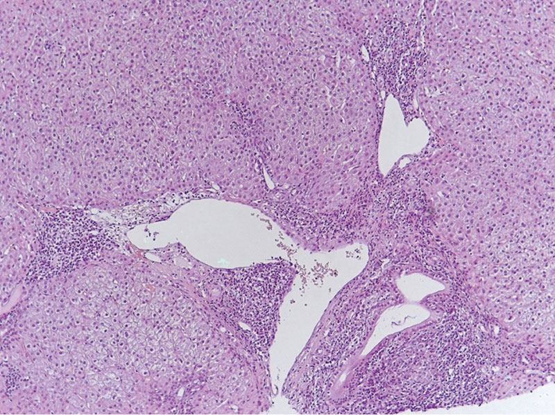 Рис. 2. Деструкция желчных протоков и формирование эпителиоидноклеточных гранулем. Увеличение × 300