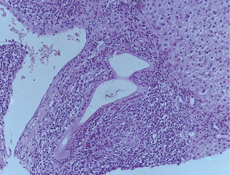 По результатам гистологического исследования биоптата печени были выявлены как характерные черты ПБХ (деструкция мелких желчных протоков), так и признаки АИГ (ступенчатые некрозы, эмпериополез и лимфоцитарные розетки); заключение морфолога: «Аутоиммунный гепатит умеренной степени активности. Первичный билиарный холангит». Стадия фиброза соответствовала F2 по шкале METAVIR. Индекс гистологической активности (ИГА) по Knodell – 9. Морфологическая картина ткани печени представлена на рис. 1 и 2.