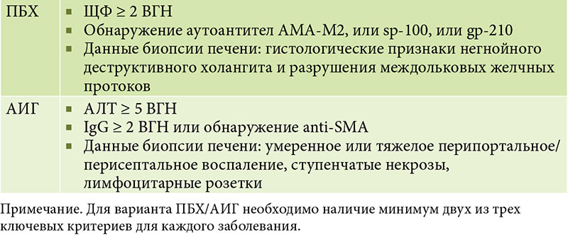 Таблица 2. Критерии вариантного синдрома ПБХ с признаками АИГ