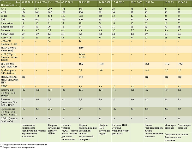 Пациентка наблюдалась у гастроэнтеролога амбулаторно: состояние расценивалось как хронический гепатит неуточненной этиологии; неоднократно проводились курсы гепатопротективной терапии препаратами адеметионина и эссенциальных фосфолипидов с незначительным клиническим эффектом в виде уменьшения тошноты и периодического снижения интенсивности кожного зуда; лабораторные изменения сохранялись (табл. 1).