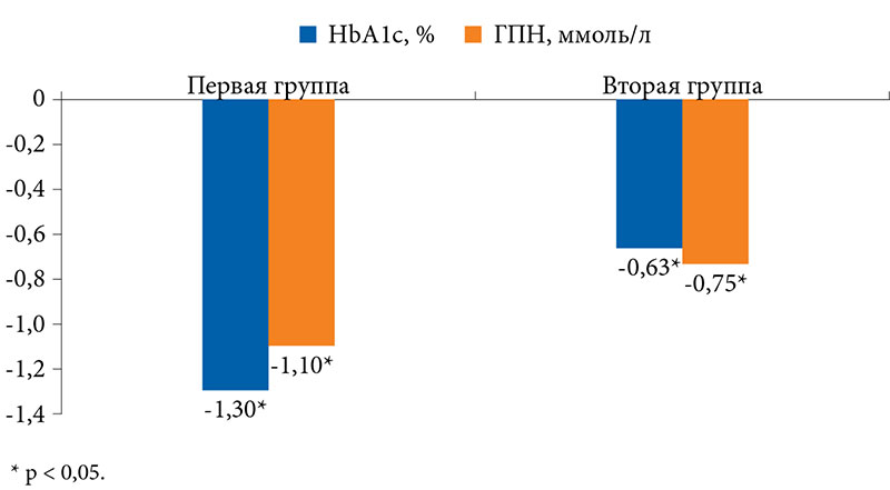 Важно отметить, что, согласно анализу данных дневников самоконтроля, а также данных, полученных в ходе беседы с пациентами, эпизоды гипогликемии отсутствовали в обеих группах.