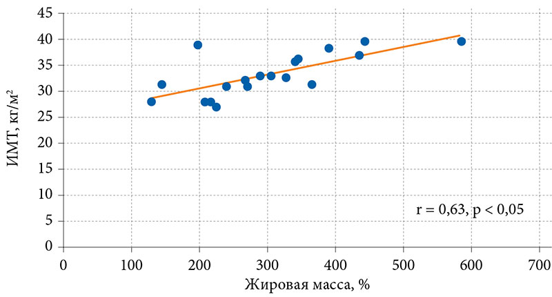 Анализ показателей, выполненный с помощью коэффициента ранговой корреляции Спирмена, выявил достоверные корреляционные зависимости. Так, значения ИМТ положительно коррелировали с уровнем HbA1c, процент жировой массы – со значениями индекса HOMA-IR. При этом масса тела отрицательно коррелировала со значениями индекса HOMA-B, то есть чем выше была масса тела, тем меньше был индекс HOMA-B (рис. 5–8). Полученные данные свидетельствуют о важной роли коррекции нарушений жирового обмена в улучшении показателей углеводного обмена.