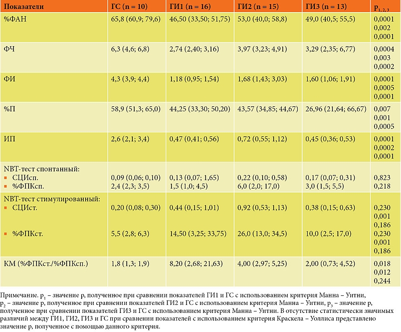 Оценка количественных и функциональных показателей эффекторной фагоцитарной функции НГ показала снижение %ФАН в ГИ1 (p = 0,0001), ГИ2 (p = 0,002), ГИ3 (p = 0,0001); ФЧ в ГИ1 (p = 0,0004), ГИ2 (p = 0,003), ГИ3 (p = 0,0002); ФИ в ГИ1 (p = 0,0001), ГИ2 (p = 0,0005), ГИ3 (p = 0,0001) против ГС. Установлено также статистически значимое снижение процессов киллинга и переваривания бактериального антигена за счет снижения %П в ГИ1 в 1,3 раза (p = 0,007), в ГИ2 в 1,4 раза (p = 0,001), в ГИ3 в 2,2 раза (p = 0,0005) по сравнению с ГС, что свидетельствует о неадекватном ответе иммунной системы на инфекционный процесс. На этом фоне отмечалось отсутствие статистически значимых изменений активности NADPH-оксидаз в спонтанном (процент формазан-позитивных клеток (%ФПКсп.), средний цитохимический индекс (СЦИсп.)) NBT-тесте (p%ФПКсп. = 0,218, pСЦИсп. = 0,823). В стимулированном (%ФПКст., СЦИст.) NBT-тесте в ГИ2 наблюдалось статистически значимое повышение NADPH-оксидазной активности по сравнению с ГС (p = 0,001). При этом отсутствовали статистически значимые различия в ГИ1 (p = 0,230) и ГИ3 (p = 0,186) по сравнению с ГС. Кроме того, отмечено сохранение резервного микробицидного потенциала, о чем свидетельствует статистически значимое повышение коэффициента мобилизации (КМ) в ГИ1 (p = 0,018) и ГИ2 (p = 0,012) по сравнению с ГС. В ГИ3 значения КМ статистически значимо не отличались от значений в ГС (p = 0,244).