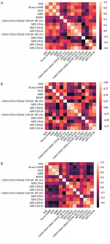 Кроме того, в ГИ1 отмечена положительная связь средней силы между концентрацией NSE и содержанием субпопуляции НГ CD63+CD16+CD62L+CD11b+ (ρ = 0,383; p = 0,308), между концентрацией MBP и содержанием субпопуляции НГ CD63+CD16+CD62L+CD11b+ (ρ = 0,350; p = 0,357), концентрацией NGF и содержанием субпопуляции НГ CD63+CD16+CD62L+CD11b+ (ρ = 0,533; p = 0,139), а также отрицательная связь средней силы между концентрацией BDNF и содержанием субпопуляции НГ CD63+CD16+CD62L+CD11b+ (ρ = -0,366; p = 0,332), что указывает на связь между количеством НГ, поляризованных к дегрануляции и образованию NETs, и повреждением нейронов, сочетающимся с недостаточностью их регенерации.