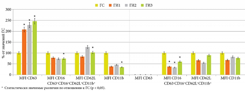 Кроме того, наблюдалась более высокая плотность экспрессии CD63 на НГ субпопуляции CD63+CD16+CD62L+CD11b+ по отношению к ГС: в ГИ1 в 2 раза (p = 0,009), в ГИ2 в 2,3 раза (p = 0,009), в ГИ3 в 2,5 раза (p = 0,010). Плотность экспрессии CD16 не менялась в ГИ1, ГИ2 и ГИ3 по сравнению с ГС (p = 0,428). Отмечалось также статистически значимое снижение MFI CD11b в ГИ3 (p = 0,006) и ГИ1 (p = 0,023), а в ГИ2 значения не отличались от значений в ГС (p = 0,075) (см. рис. 1).