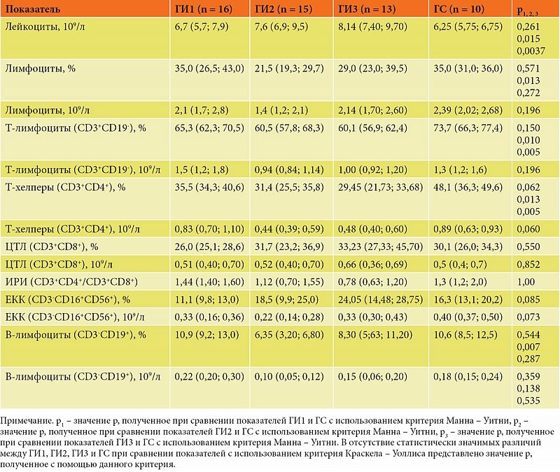 При оценке общего анализа крови показатели общего количества лейкоцитов и субпопуляций лимфоцитов в ГИ1 не отличались от таковых в ГС (p1–4 > 0,05). У пациентов ГИ2 и ГИ3 выявлено увеличение уровня лейкоцитов – 7,6 (6,9; 9,5) и 8,14 (7,40; 9,70) против 6,25 (5,75; 6,75) × 109/л в ГС (р1 = 0,015, р2 = 0,0037). В ГИ2 и ГИ3 установлено также снижение содержания лимфоцитов – 21,5 (19,3; 29,7) и 29,0 (23,0; 39,5) против 35,0 (31,0; 36,0)% в ГС (р1 = 0,013, р2 = 0,272) (табл. 1).