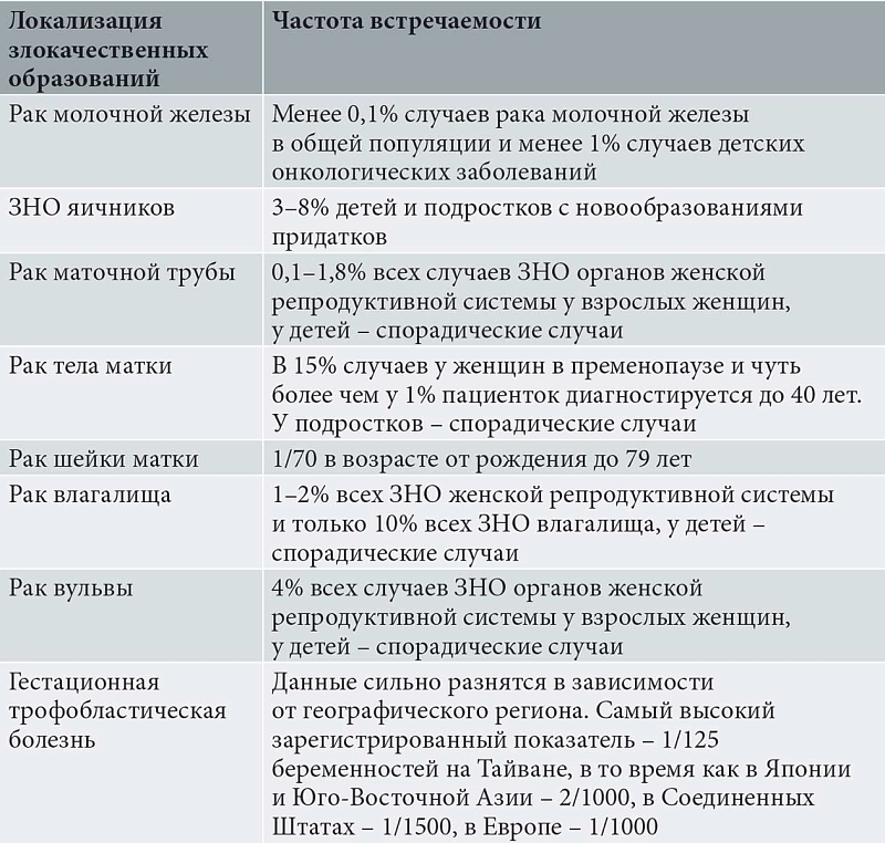 У детей и подростков отмечаются в основном стромальные карциномы, включая ювенильные гранулезоклеточные опухоли и опухоли из клеток Сертоли – Лейдига, рабдомиосаркомы и герминогенные опухоли яичников (табл. 1).